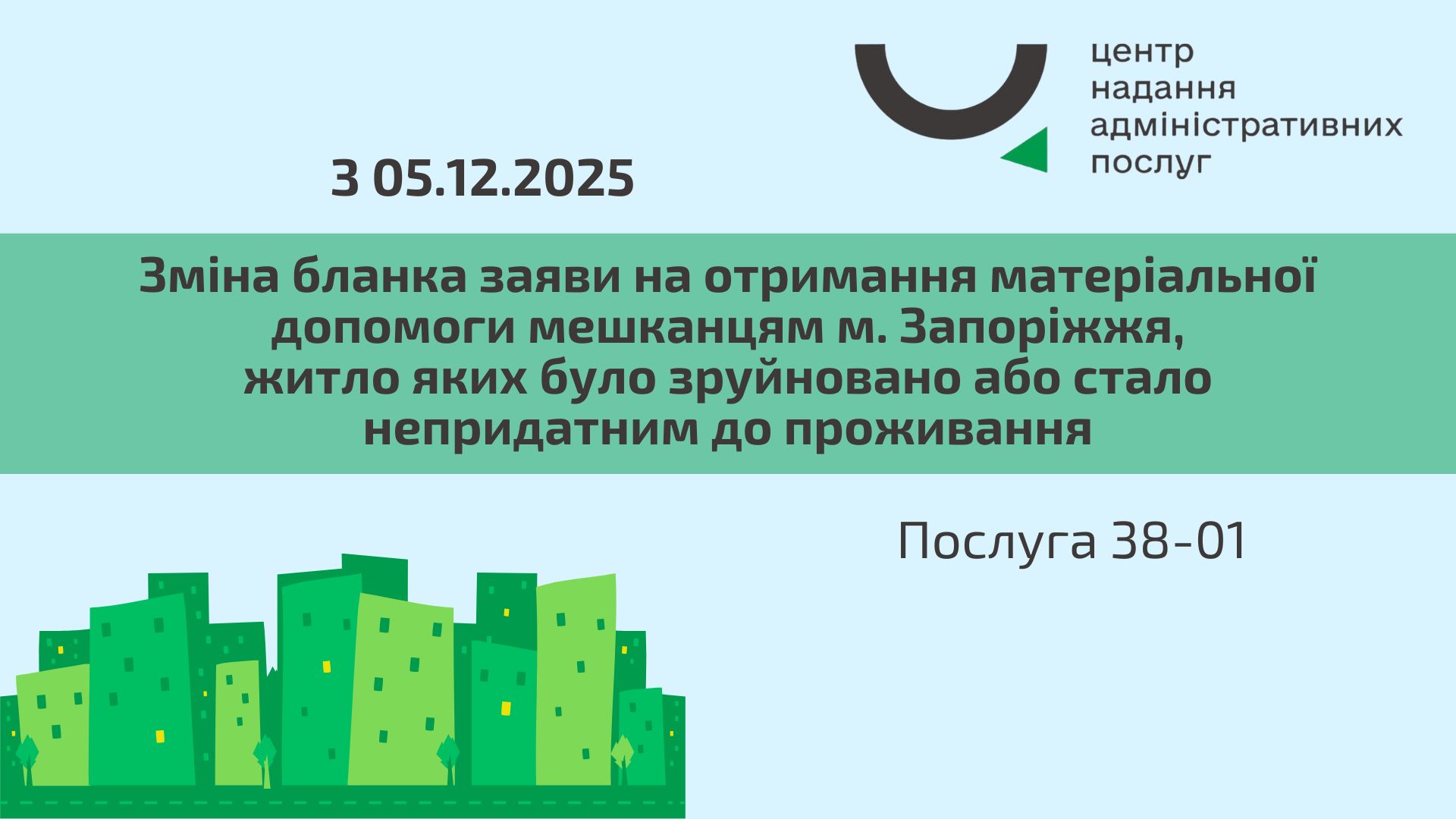 Бланк послуги можна завантажити із сайту ЦНАП м. Запоріжжя за посиланням (код послуги – 38-01): https://cnap.zp.gov.ua/poslugi/333